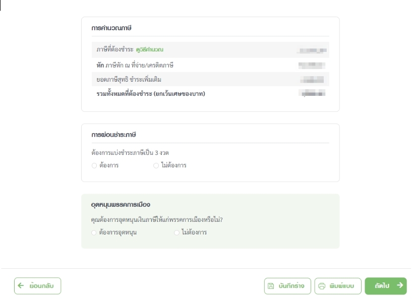 ระบบจะทำการคำนวณภาษีที่ต้องชำระให้อัตโนมัติ ซึ่งหากมีการชำระภาษีไปแล้วระบบจะแจ้งยอดที่ชำระเกิน โดยสามารถขอคืนภาษีที่ชำระเกินได้ รวมถึงนำเงินภาษีที่ชำระเกินไปอุดหนุนพรรคการเมืองได้ แต่หากชำระภาษีไว้น้อยเกินไป ระบบจะให้เลือกช่องทางในการชำระเพิ่ม หลังจากตรวจสอบข้อมูลทั้งหมดเรียบร้อยแล้วให้กด “ถัดไป”